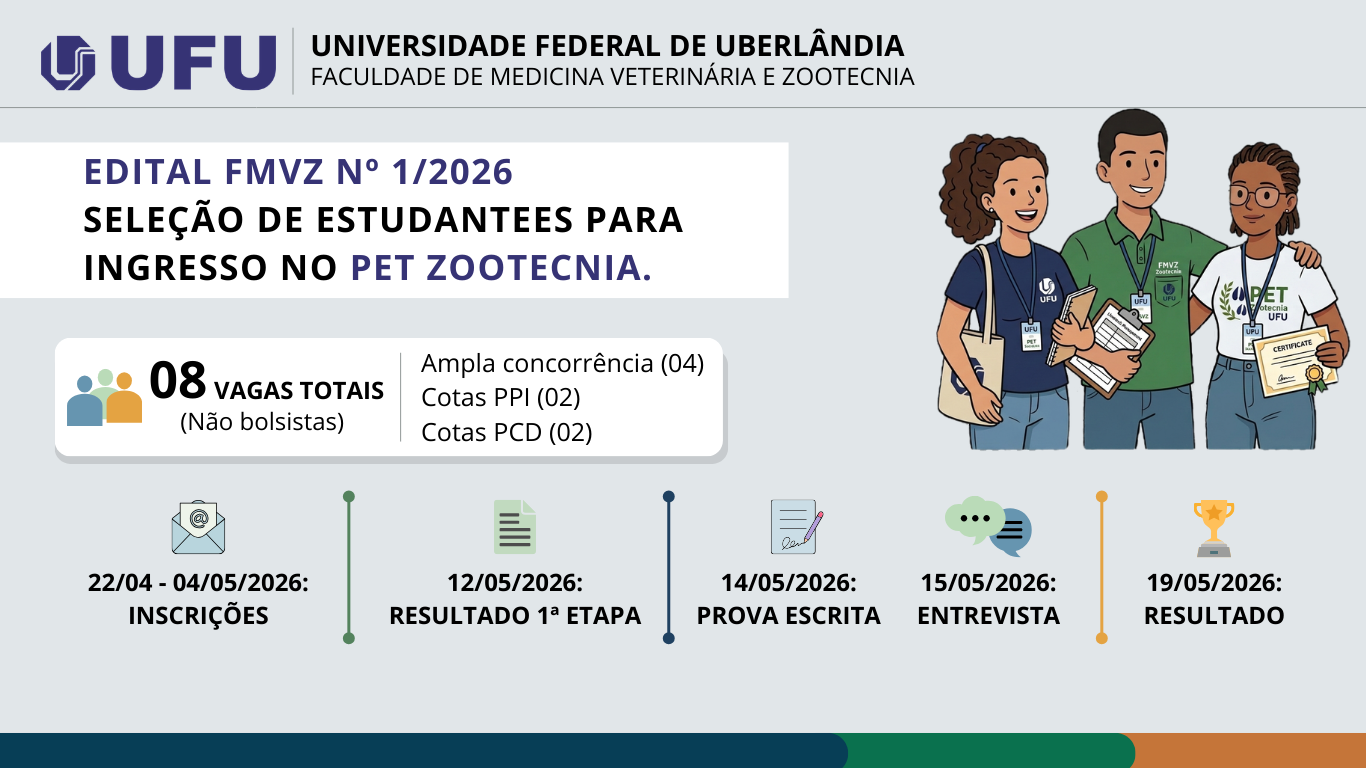 A Faculdade de Medicina Veterinária e Zootecnia (FMVZ) da Universidade Federal de Uberlândia comunica a abertura do processo seletivo para ingresso de novos membros no Grupo PET Zootecnia..